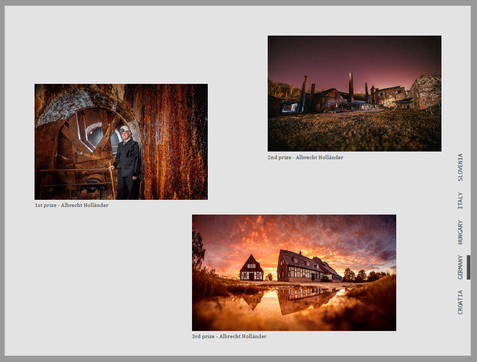 Germany is represented by Albrecht Holländer, a young photographer who represents an old silver mine in Saxony, whose remains are protected by the UNESCO-protected cultural property.