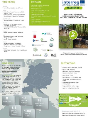 Climate change consequences are already visible in central Europe, and call for better risk management coordination. TEACHER-CE addresses this need by integrating and harmonizing results of previously funded INTERREG, Horizon2020, and Life projects into the TEACHER-CE Toolbox. This tool focuses on climate-proof management of water related issues such as floods, heavy rain and drought risk prevention, small water retention measures and protection of water resources through sustainable land-use management. The direct local and regional implementation helps municipalities and regions in adapting their processes to the changing climate conditions.